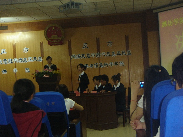 5月24日晚,潍坊学院12届辩论赛在8#321法学院模拟法庭进行了一场巅峰之战,本次辩论赛决赛在法学院与数学与信息科学学院之间展开。同时出席本场比赛的领导有校团委书记周莹,法学院院长等。