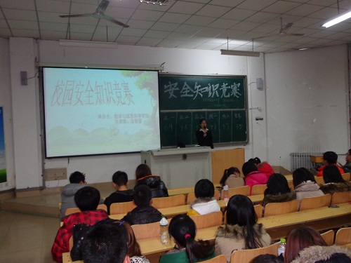 为帮助当代大学生树立安全思想,加强安全防范意识,提高自我管理、自我防范、自我保护的意识。我院于11月23日晚7:00在8#122举办了有关“校园安全知识”的竞赛。出席本次活动的有,数学学院学生会主席于晓枫,秘书长胡雪慧,副主席张海龙、李银涛、高占、郝春玲,副秘书长张淑洁、王咏梅以及各部部长。
