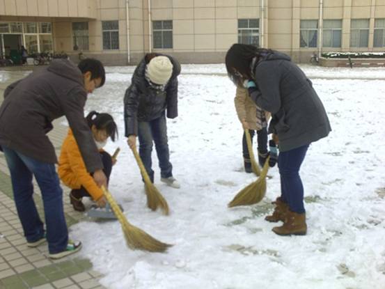 为了方便师生进出教学楼,保证广大同学们的出行安全,我院于12月24日下午在八号教学楼前进行了一场积雪大扫除活动。参加本次活动的是数学与应用数学一班的全体学生。