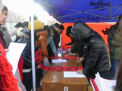 2012年的最后一天12月31日,我院大学生书画协会在第二餐厅前的广场上隆重的举办了“元旦迎新春送春联”活动。本次活动特别邀请了有成斋的四位青年书法家,他们亲笔献书,现场写出一幅幅充满喜庆吉祥的春联,免费送给前来参与活动的各位同学。