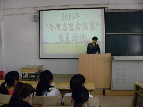 “2013年潍坊学院西部志愿者招募”活动已顺利启动,为了提高同学们的积极性,确保西部志愿者招募计划的顺利实施,5月21日上午9点,我院在8#123举办了“2013年西部志愿者招募”动员活动。我院学生王伟军担任此次活动的嘉宾,参加本次活动的有我院各年级的学生代表。