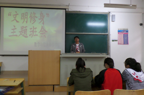 为了促进同学的精神文明建设,丰富同学们的大学生活,5月28日下午,我院数学与应用数学一班和二班在8#123举行了以“文明修身”为主题的主题班会,让同学们互相讲解自己对“文明修身”的理解。