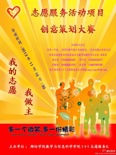 相信通过队内成员的群策群力,此次“志愿服务项目——创意设计大赛”定会取得圆满成功!我院“1+1志愿服务队”也会更加辉煌!