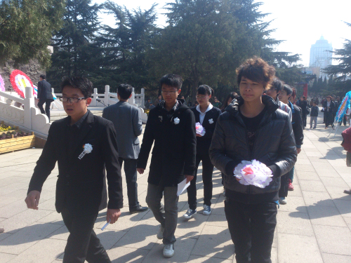 下午2点30分,伴随着庄重的国际歌,同学们胸佩白花肃立在革命英雄纪念碑前,雄伟的纪念碑在苍松翠柏的衬托下格外庄严肃穆。当宣布为革命烈士默哀三分钟的时候,现场浓重的悲壮气氛深深撼动着每一位前来扫墓的群众。学生代表用激昂的陈词表达了对革命烈士的敬仰与追思,此后,同学们又在队长张涛的带领下庄严宣誓,以此来接受心灵的洗涤,告慰先烈的英魂。之后,同学们来到中共潍坊历史图片展馆,参观了新民主主义革命时期许许多多革命烈士的简介和资料后,同学们更加了解了烈士们的那种敢于奉献,不畏艰辛,勇敢的爱国主义精神。站在烈士墓前,同学们纷纷敬献白花,表达自己对英雄的哀思。下午5点,祭扫活动结束,短短的几个小时,同学们却走过了漫长的的革命历史道路,带着一份心灵的触动,同学们离开了革命烈士陵园。
