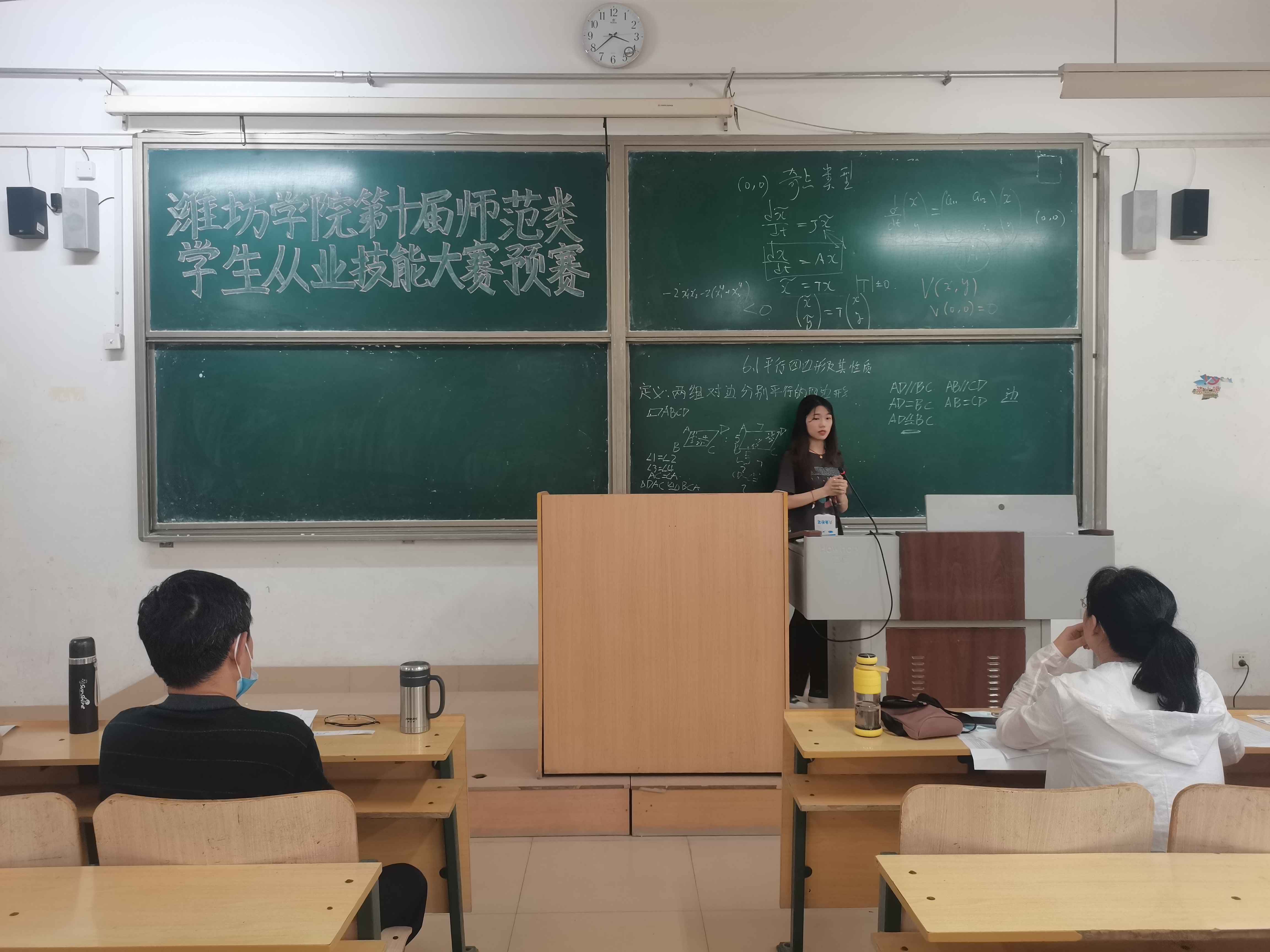 为培养师范类学生的教学基本能力,帮助学生提高教学基本素质,掌握先进的教学理念,数学与信息科学学院于2022年6月3日下午在人合楼8126、8125、8129和8131四个教室组织开展了潍坊学院第十届师范类学生从业技能大赛预赛。