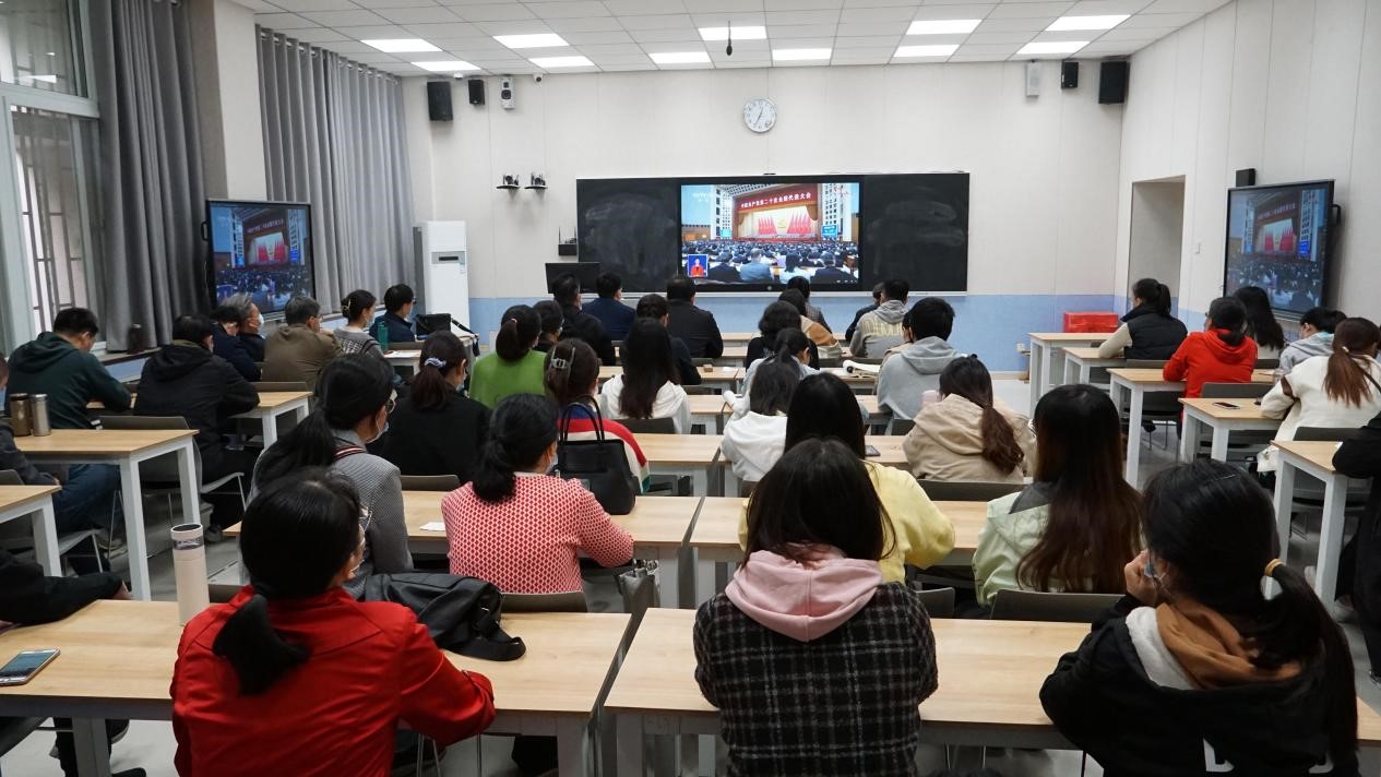 在场的师生都怀着无比激动的心情认真聆听报告。习近平总书记的讲话激情澎湃,振奋人心,向全党全国发出了在更高起点上推进改革开放,乘势而上开启全面建设社会主义现代化国家新征程、向更高的目标进军而团结奋进的进军号令!回顾党的历史,我们党始终坚守为中国人民谋幸福、为中华民族谋复兴的初心和使命,义无反顾地向这个目标前进。在观看直播现场,广大干部师生边看边做记录,时不时报以热烈的掌声。
