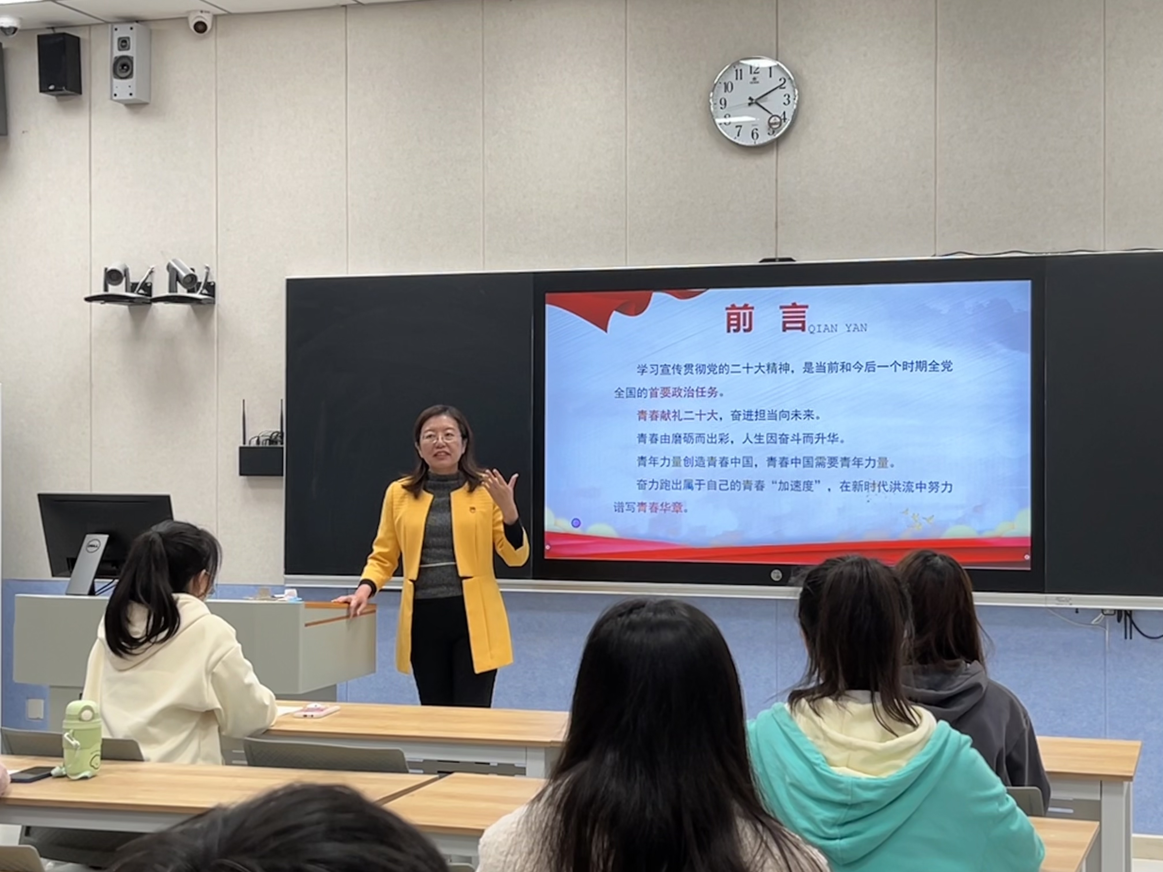 此次思想政治课由党总支书记周莹主讲,首先从入党积极分子培训的重要意义和入党条件方面坚定了学员们的初心和信仰,引导学员们系好入党的第一粒扣子。课堂期间,学员们回答问题积极踊跃,周莹书记以书本作为礼物送给大家,鼓励大家牢记共产党人的奋斗目标,努力学习,取得优异成绩。随后带领全体入党积极分子坚持原汁原味学、反复深入学、结合实际学,把二十大的精神作为此次政治课堂的核心内容,切实把入党积极分子的思想和行动统一到党的二十大精神上来。课堂最后,周莹书记带领大家合诵诗歌《中国,上场》,点燃全场,热血沸腾。