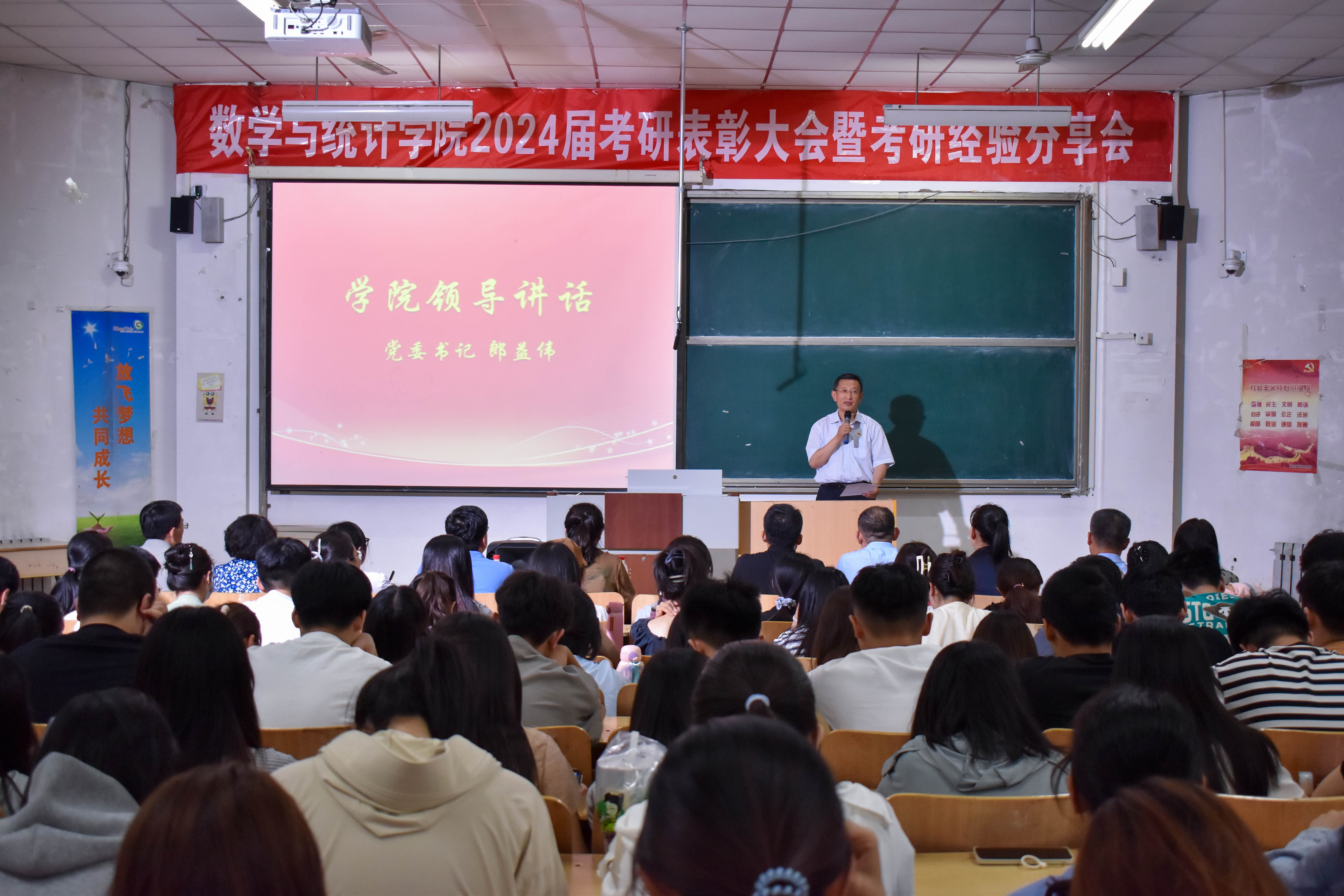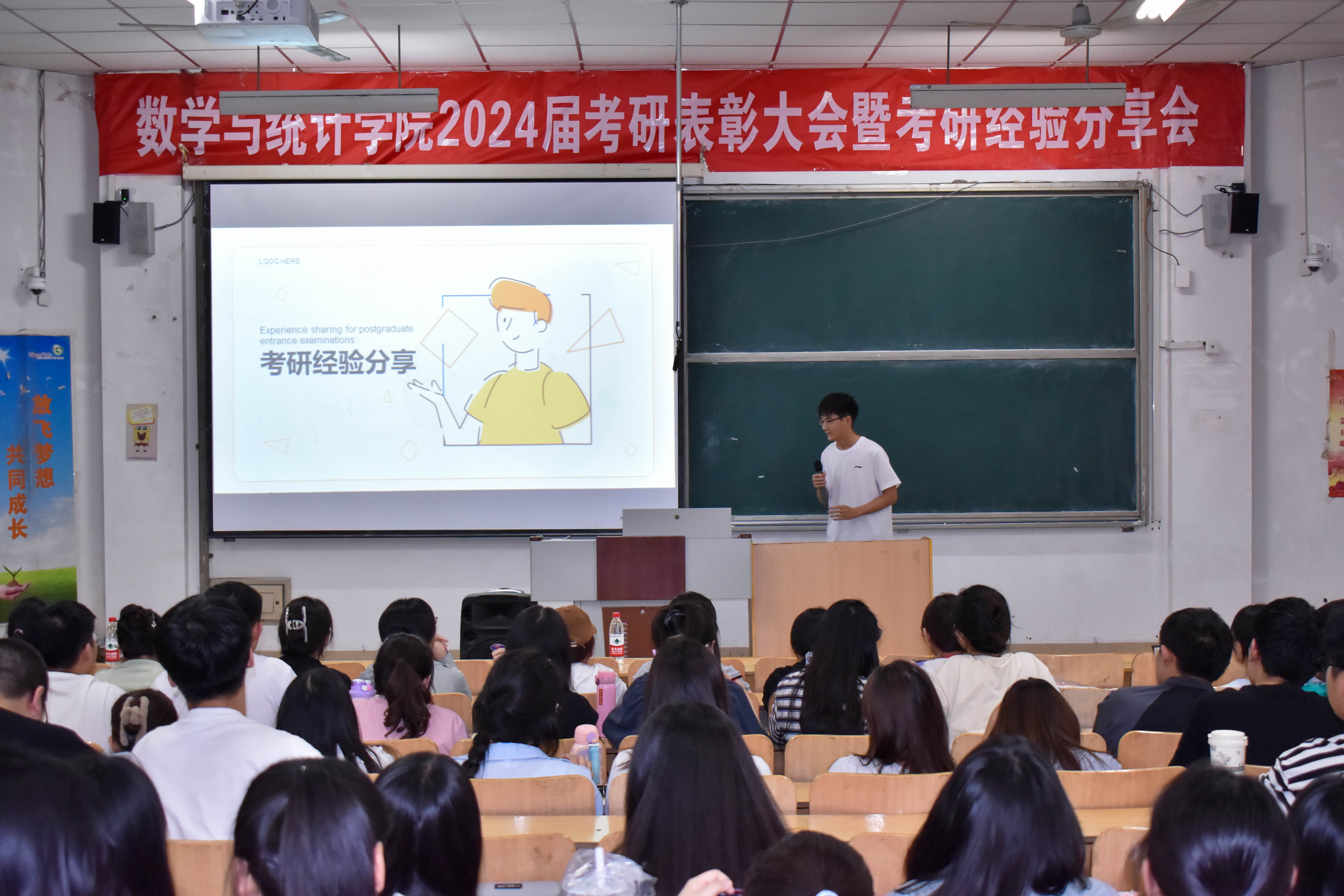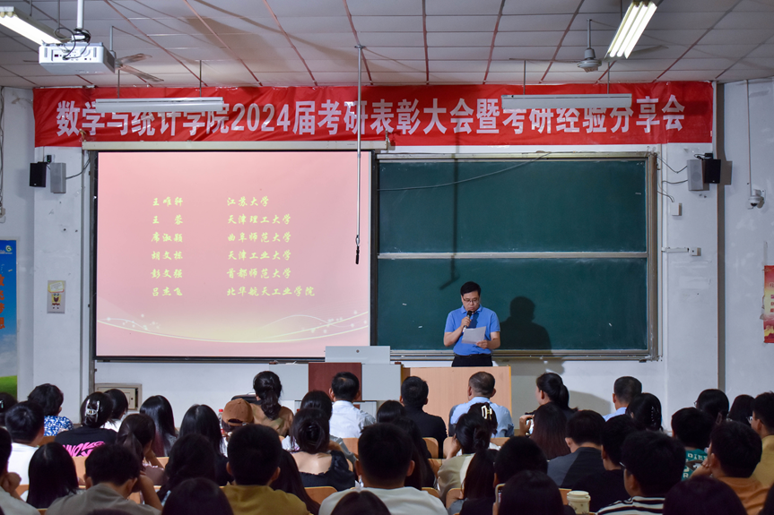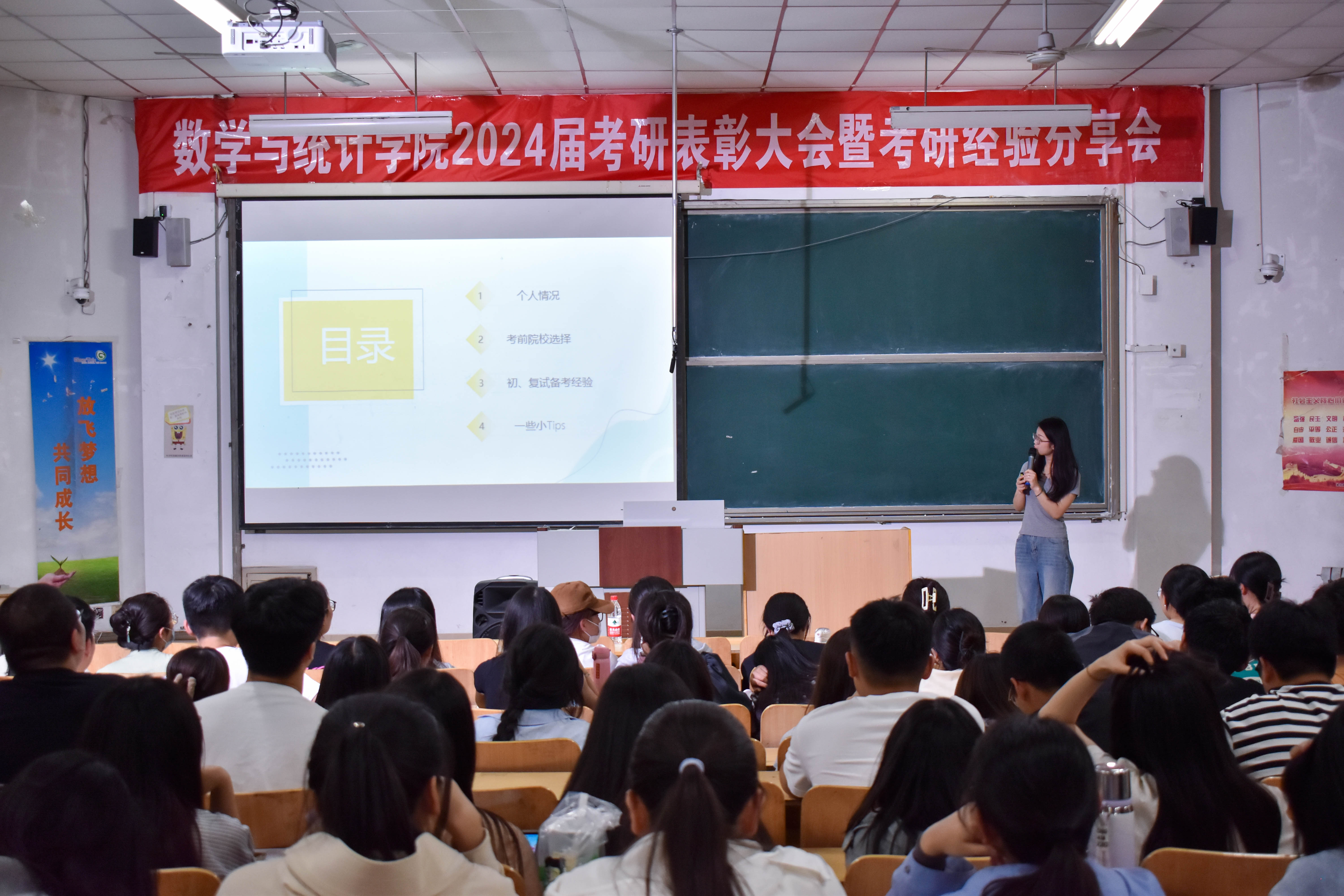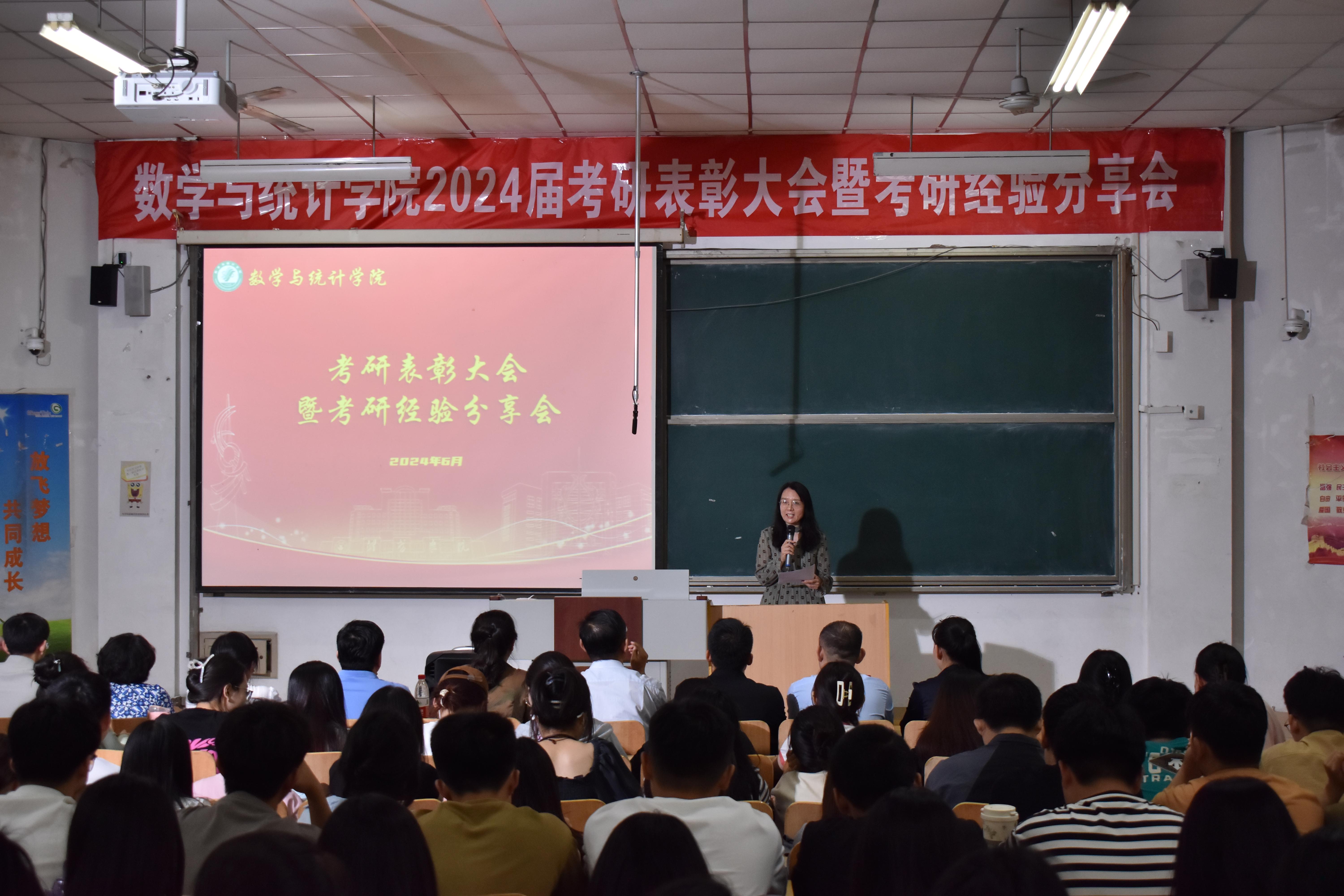 为深入推进学院学风建设,充分发挥优秀榜样引领作用,增强学生考研的动力和信心,6月5日晚,数学与统计学院在8122教室召开“2024届考研表彰大会暨考研经验分享会”,表彰2024届考研升学学生,动员启动2025届毕业生考研工作。学院领导班子成员、院长助理、各专业负责人、教研室主任、全体辅导员出席,2020级优秀考研毕业生、2021级全体学生参加。大会由学院党委副书记杨颂主持。