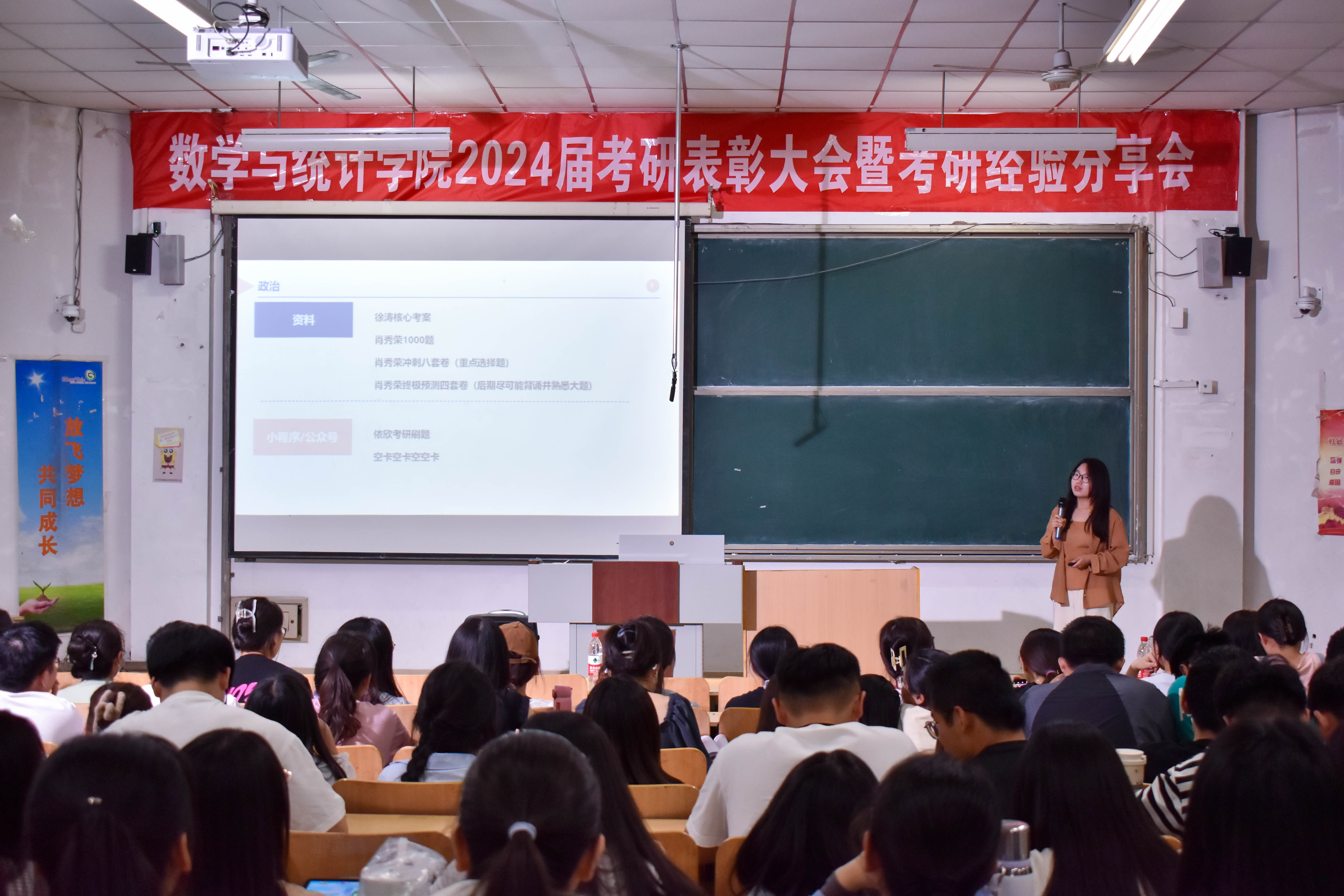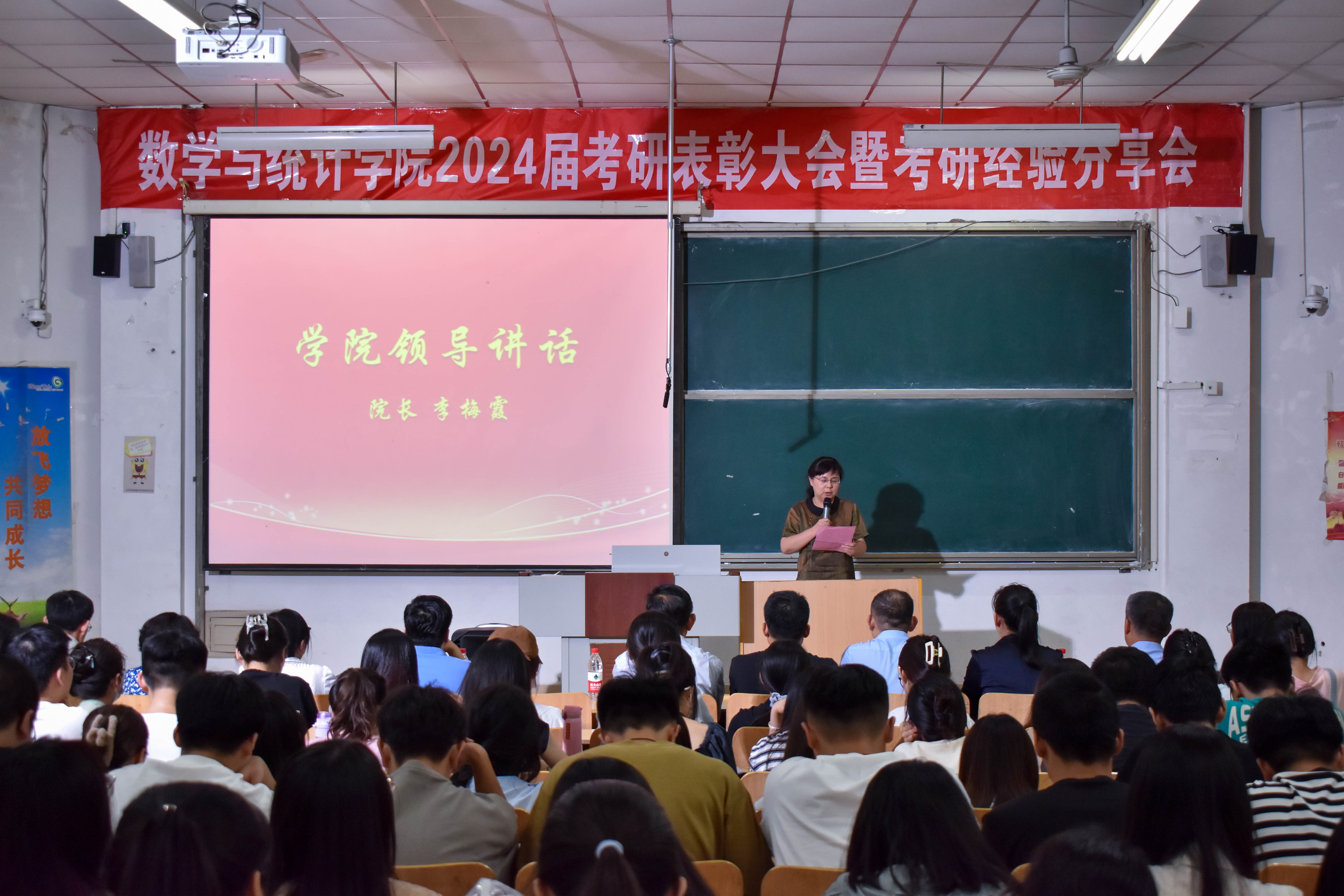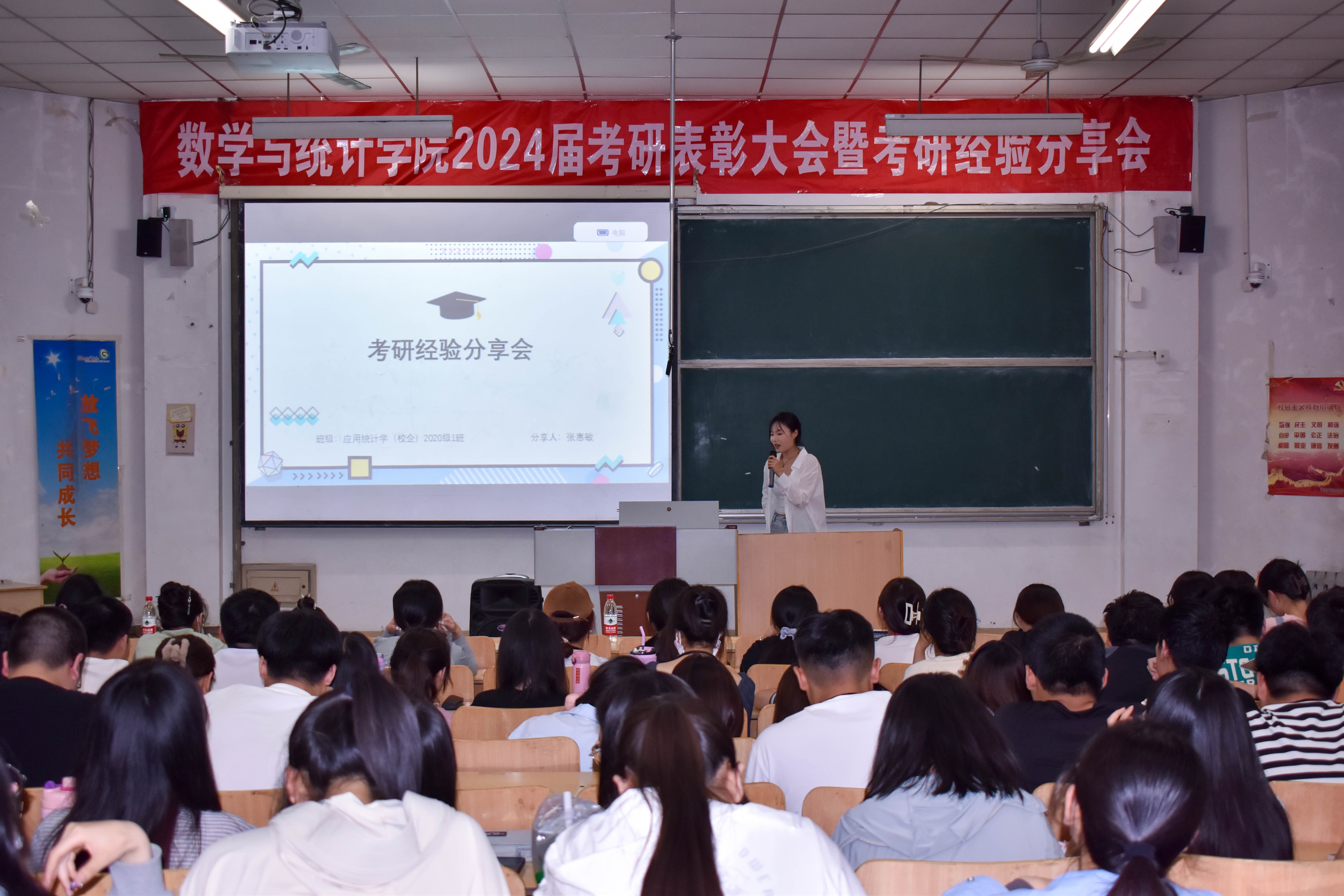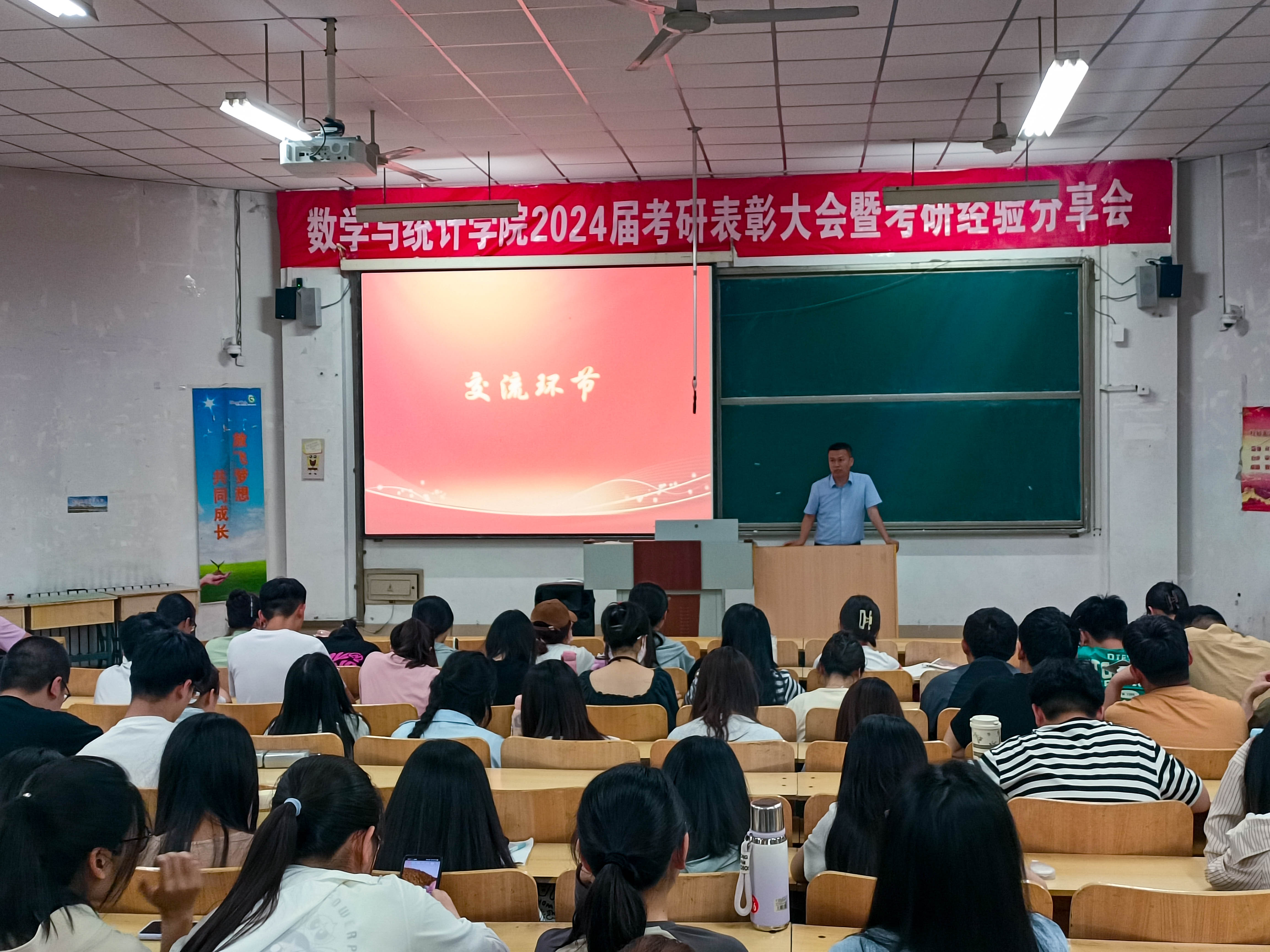 为深入推进学院学风建设,充分发挥优秀榜样引领作用,增强学生考研的动力和信心,6月5日晚,数学与统计学院在8122教室召开“2024届考研表彰大会暨考研经验分享会”,表彰2024届考研升学学生,动员启动2025届毕业生考研工作。学院领导班子成员、院长助理、各专业负责人、教研室主任、全体辅导员出席,2020级优秀考研毕业生、2021级全体学生参加。大会由学院党委副书记杨颂主持。