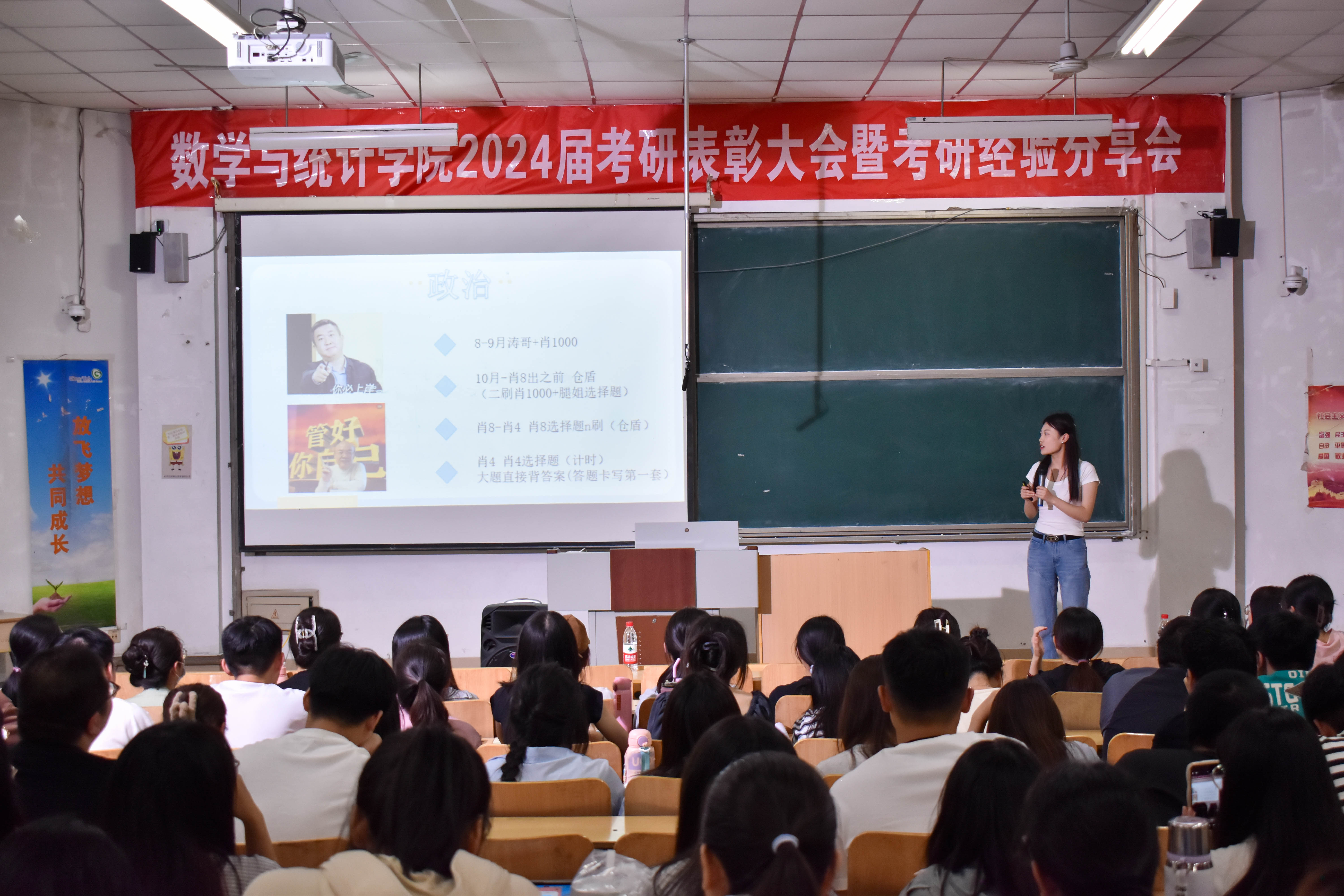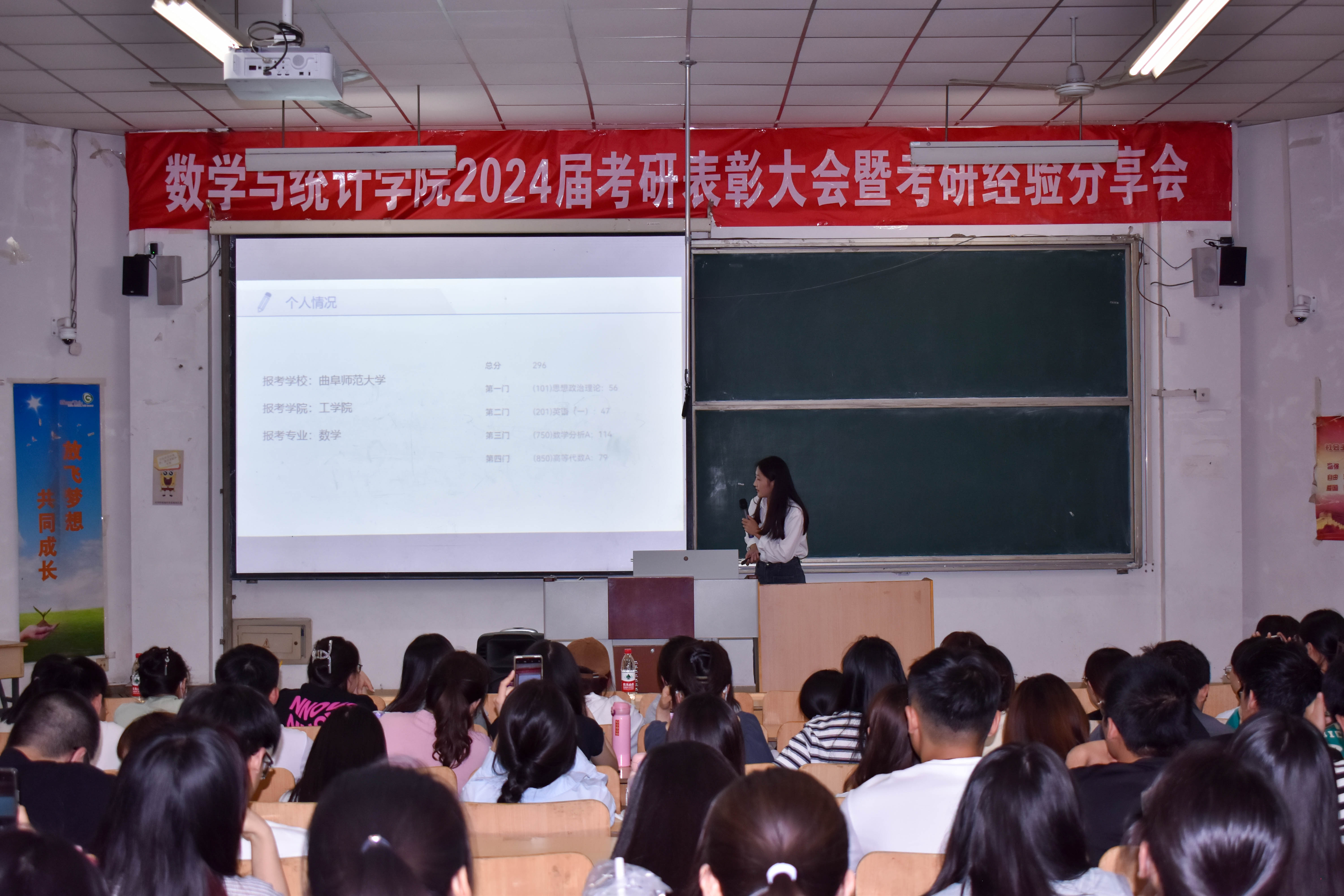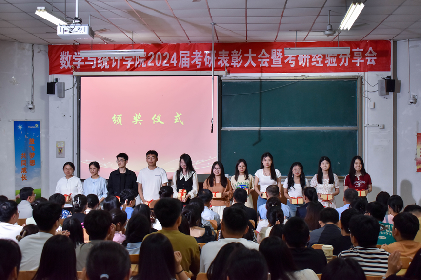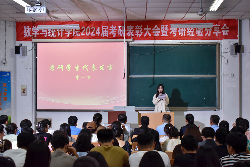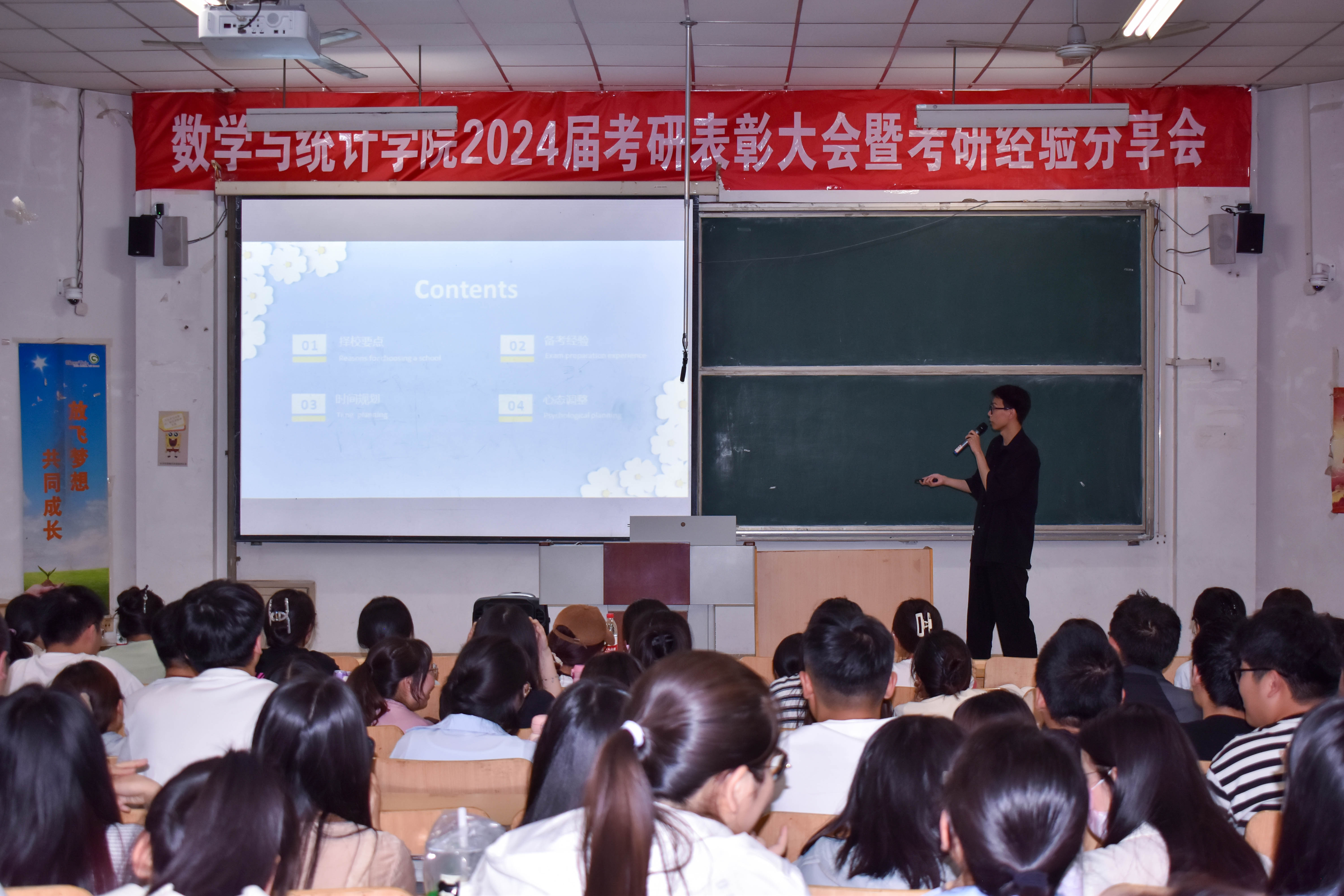 为深入推进学院学风建设,充分发挥优秀榜样引领作用,增强学生考研的动力和信心,6月5日晚,数学与统计学院在8122教室召开“2024届考研表彰大会暨考研经验分享会”,表彰2024届考研升学学生,动员启动2025届毕业生考研工作。学院领导班子成员、院长助理、各专业负责人、教研室主任、全体辅导员出席,2020级优秀考研毕业生、2021级全体学生参加。大会由学院党委副书记杨颂主持。