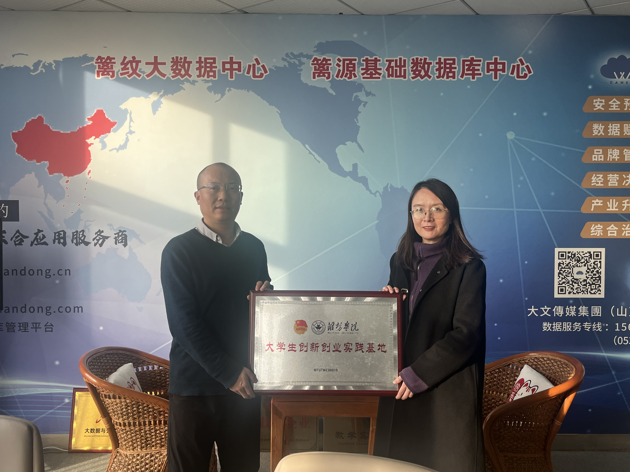 11月17日,数学与统计学院与云上数创信息技术(山东)有限公司举行“大学生创新创业实践基地”揭牌仪式。学院党委副书记杨颂、院长助理丁伟民、学工办主任王鑫莉、团委副书记宋志鹏、青年博士张炳杰、云上数创信息技术(山东)有限公司负责人王利民出席仪式。