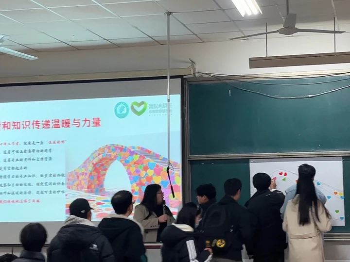 现场还设置“暖心桥”集体共建环节,参会同学将写有自己姓名的爱心贴纸共同贴绘于桥梁线稿上,寓意每位朋辈心理工作者都是支撑同学们心理健康的基石,强化了团队凝聚力与责任认同。