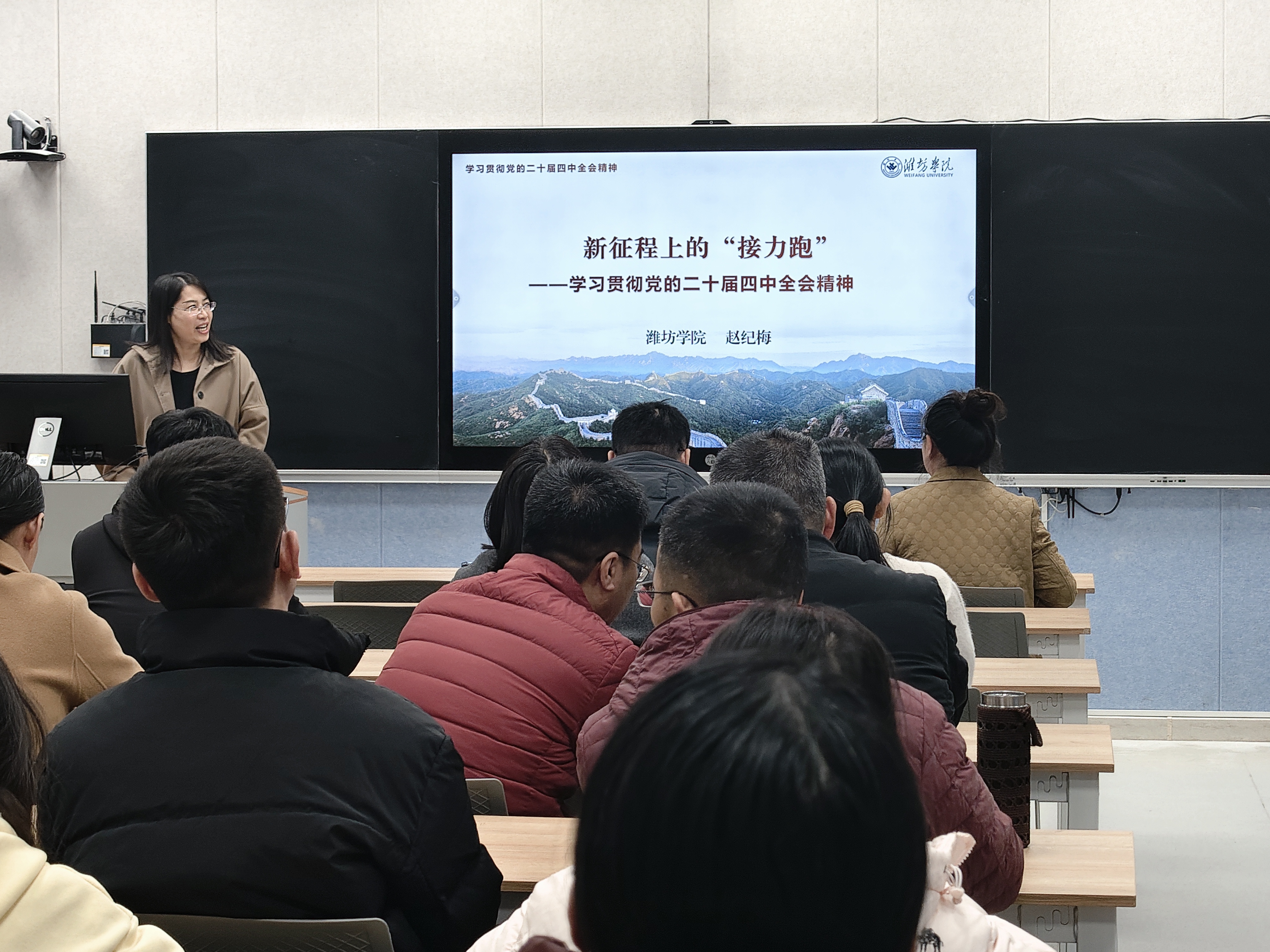 赵纪梅以《新征程上的“接力跑”》为题,系统梳理并深入解读了全会召开的背景意义、主要成果与核心要义等。结合国内外风险挑战与当前形势,重点阐述了坚持和完善中国特色社会主义制度、推进国家治理体系和治理能力现代化的总体要求、总体目标和重点任务。赵纪梅还围绕“十五五”规划建议,对加快实现高水平科技自立自强、引领发展新质生产力等重要内容进行了深刻剖析,引导师生们从国家战略层面理解学科发展与社会需求之间的紧密联系。