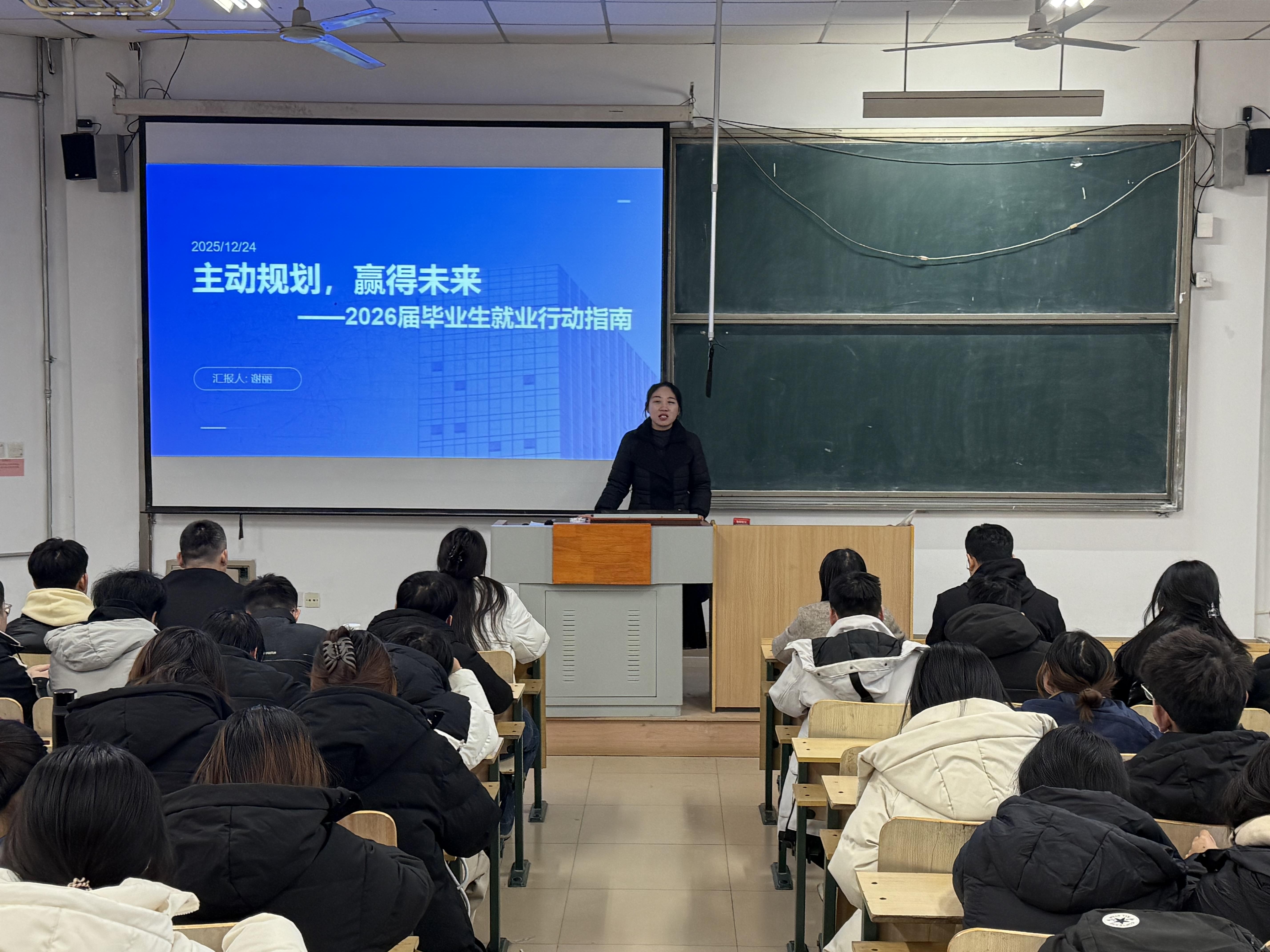 为助力毕业生明晰就业方向、提升就业竞争力,12月24日下午,数学与统计学院在人合楼举办2026届毕业生就业指导会。学校就业指导中心主任谢丽、武装部正科级秘书虞宏章、校团委李亚婷、学院党委副书记杨颂、团委副书记宋志鹏出席活动,退伍学生代表、学院2026届全体毕业生参加,学工办主任王鑫莉主持。