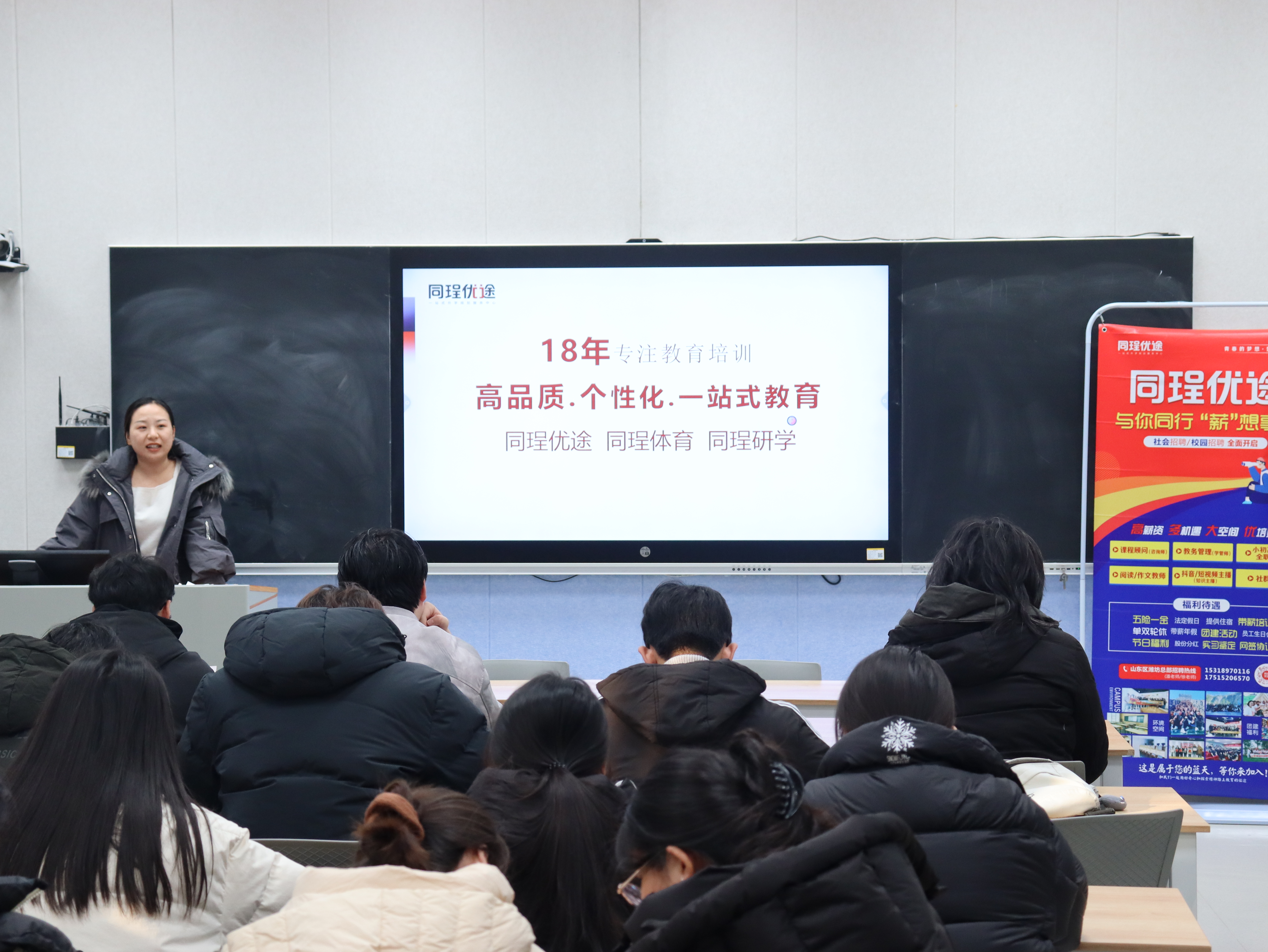 单位负责人立足当前教育行业发展趋势与人才需求现状,系统阐述了同珵优途的招聘体系与培养路径。她指出,机构业务覆盖小初高全学科教学、升学规划及教育直播运营等多个板块,相应设有学科教师、升学咨询师、课程策划、教育主播等多元化岗位。她强调,在选拔标准方面,除了扎实的专业知识,机构尤为看重应聘者的表达沟通能力、快速学习与适应能力以及团队协作精神。针对近年来教师岗位竞争日趋激烈的现象,负责人进一步分析,教育机构在招聘中不仅关注候选人的学科功底与教学技能,更重视其是否具备丰富的教学实践经历和持续的专业成长意愿。毕业生们围绕岗位要求、发展通道、培训体系等积极提问,负责人逐一给予细致解答。