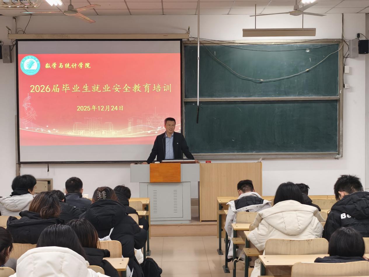 为提高2026届毕业生就业安全意识,助力学子顺利步入职场,12月24日下午,数学与统计学院在人合楼举办2026届毕业生就业安全教育培训。学工办主任王鑫莉主讲,2026届毕业生参加。
