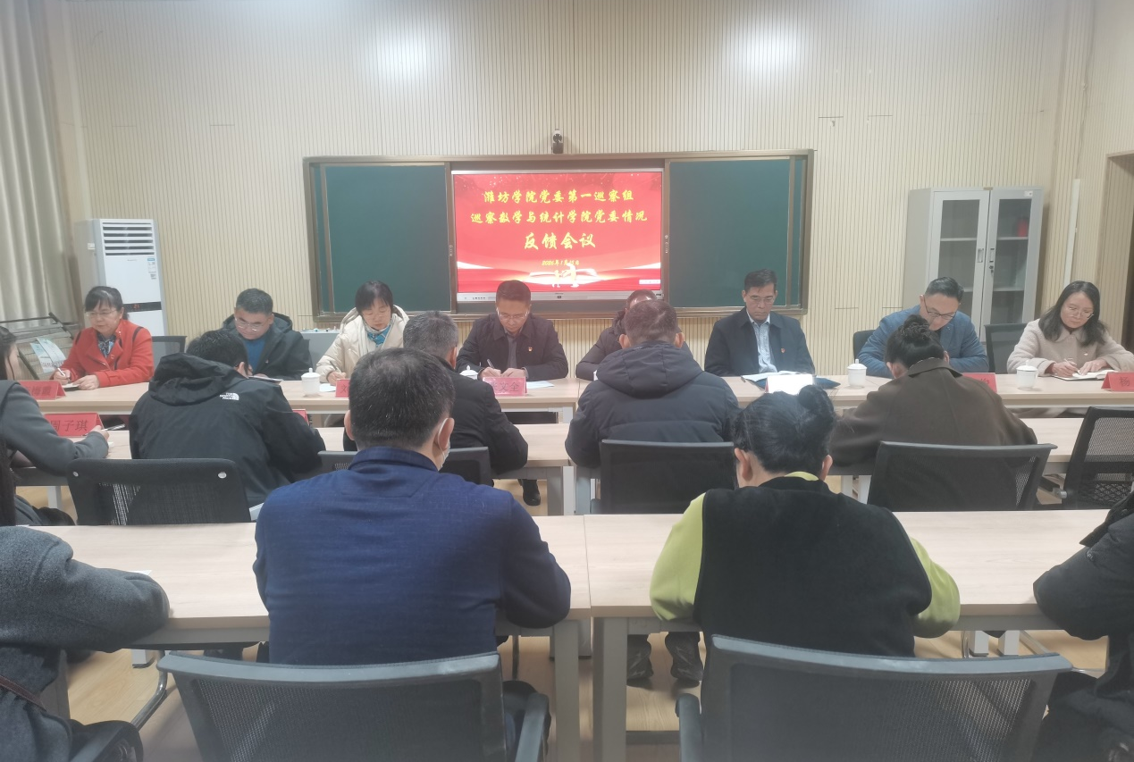 根据学校党委关于巡察工作的统一部署,2026年1月15日,党委第一巡察组巡察数学与统计学院党委情况反馈会召开。学校党委巡察办公室副主任张文全、党委第一巡察组组长孙军,副组长刘希美、刘先学、王坤及巡察组全体成员出席会议。数学与统计学院党委领导班子全体成员、科级干部、党支部书记及师生代表参加会议。