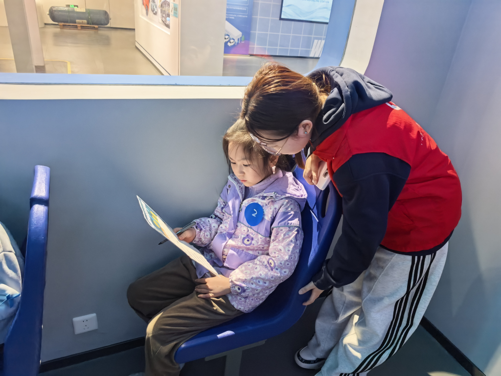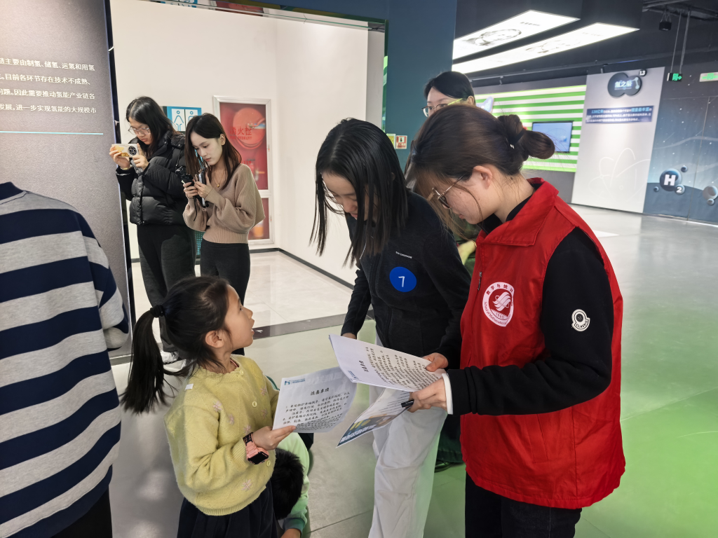 志愿者们在岗前培训中认真投入、积极互动,短时间内便熟练掌握了氢能基础知识和讲解要点,为当好“科普使者”打下坚实基础。进入展区后,志愿者们迅速切换身份,各司其职、协作有序。入口处,他们热情迎接前来参观的家长和儿童,主动发放氢能科普宣传手册;通道旁,他们引导人流、维持秩序,确保参观路线畅通有序;展区前,志愿者们化身科普讲解员,结合展板内容与实物模型,用生动形象的语言讲解氢能原理与应用场景;VR互动体验区里,他们耐心指导市民操作设备,协助大家沉浸式感受科技魅力。现场气氛活跃,孩子们的惊叹声和家长们的称赞声此起彼伏。